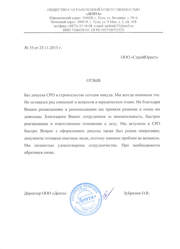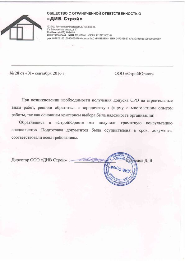 Отзывы клиентов "СтройЮрист" по вступлению в СРО в Видном