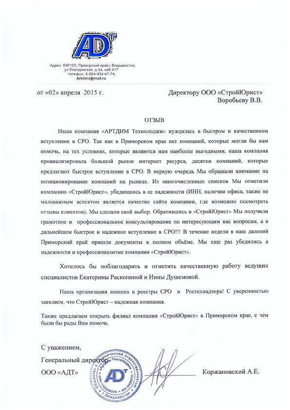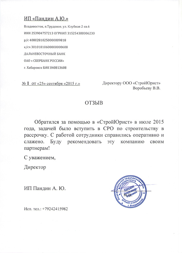 Отзывы клиентов "СтройЮрист" по вступлению в СРО в Видном